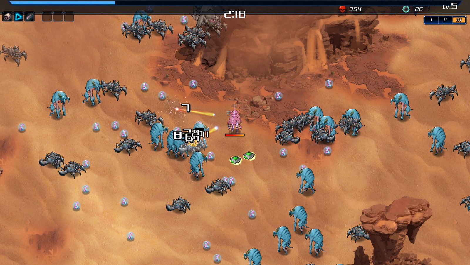 这是一款roguelite元素的弹幕生存游戏。